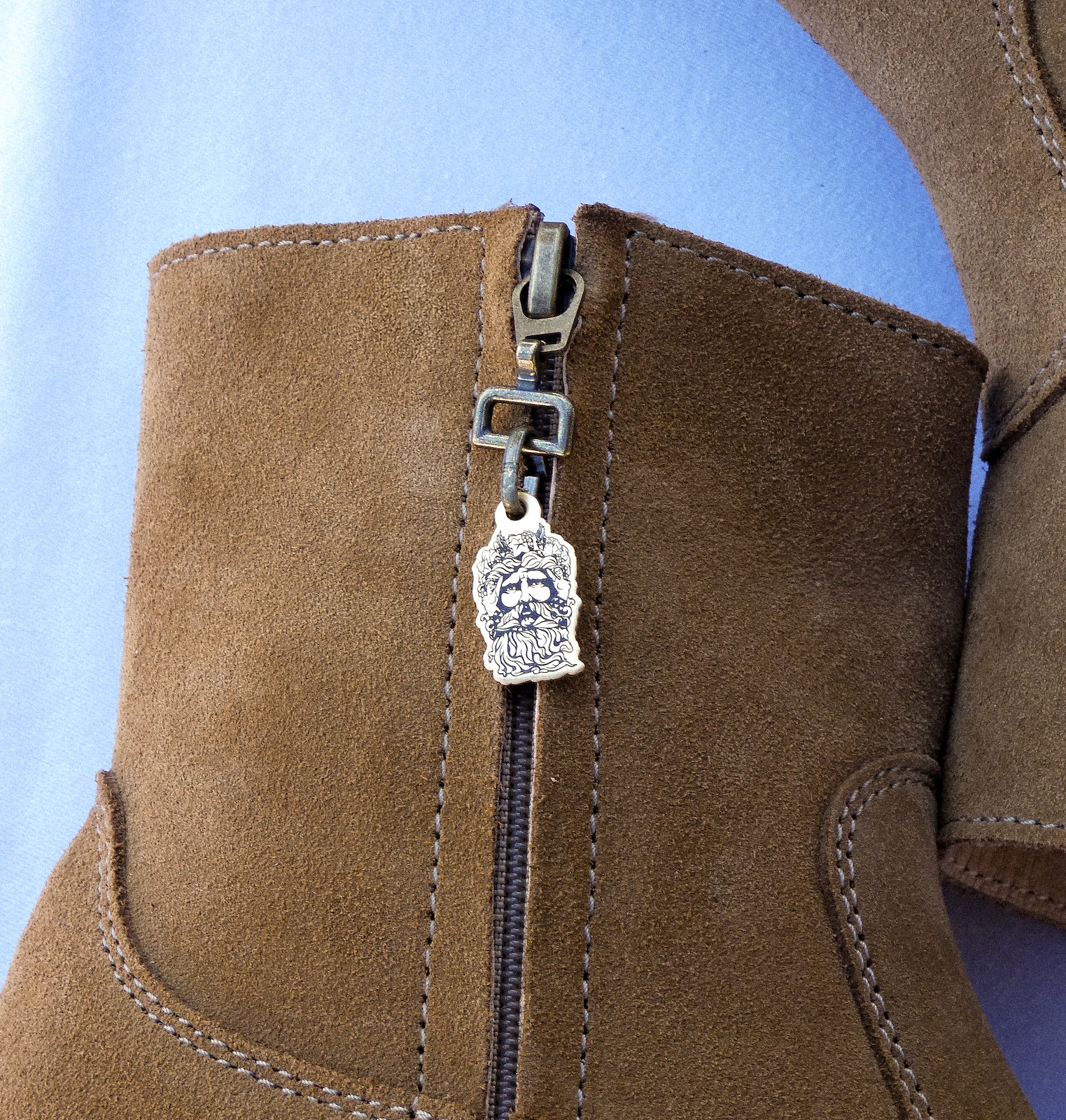 Collaboration entre Les Bains Gardians & La Botte Gardiane. Un incontournable Camarguais et l'accessoire indispensable des Gardians. Des bottes en daim beiges avec détail médaillon Bacchus en laiton sur la fermeture éclair. Entièrement fabriquées en France, à la Main dans l'atelier de la Botte Gardiane.